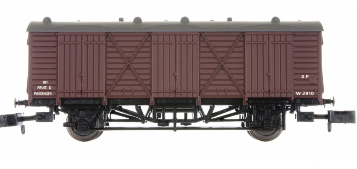 Fruit D wagons were large ventilated wooden bodied vans designed for the fast and efficient transportation of fruit. They were first constructed in the 1930’s for use by GWR and later in the 1950’s by BR. The vans themselves had three large double side doors for fast unloading and loading and were usually seen as part of passenger or fast goods trains. Out of season these vans were used as parcel or luggage vans. As road transport took over as the principal way of transporting fruit, fruit D vans were converted and used as permanent parcels or stores vans and remained in service in this way into the 1980’s.