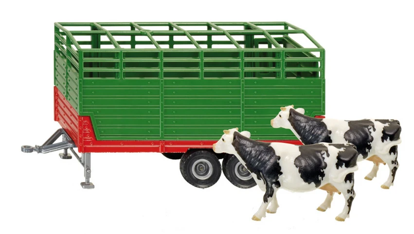 The twin axled stock trailer features a ramp with safety rails that can be lowered to allow livestock on board, and stabilisers to keep the trailer steady while stationary. It can be attached to the hitch of any SIKU tractor. The pack includes two freisian cattle.